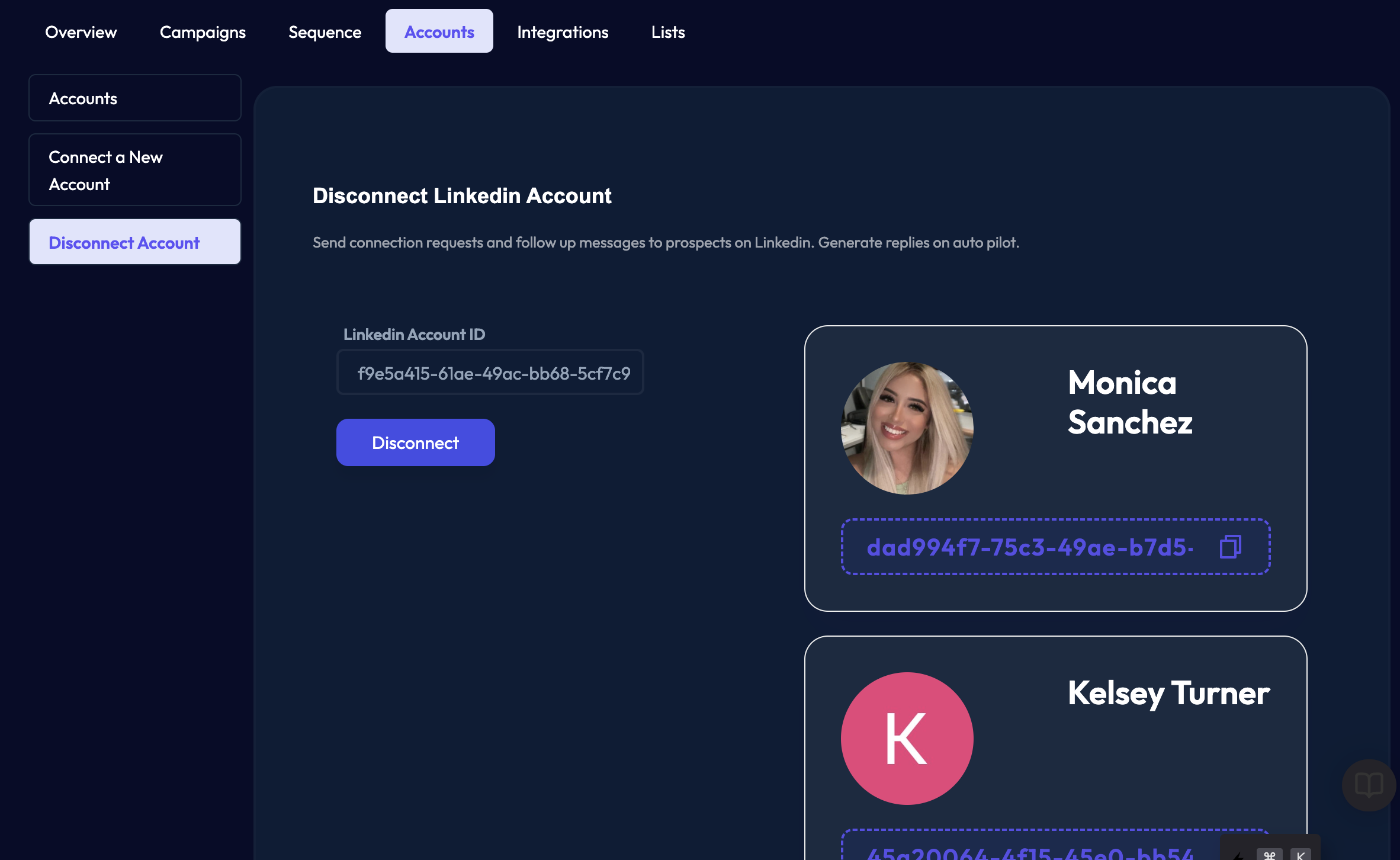 <figure><img src="https://379495413-files.gitbook.io/~/files/v0/b/gitbook-x-prod.appspot.com/o/spaces%2FZO5zT3uqNJDIwoKOPotT%2Fuploads%2FmDsm7CdEQaUK1KgYilQD%2Fimage.png?alt=media&#x26;token=965c388e-b968-46c9-b58f-d98ea1078c6e" alt=""><figcaption><p>Disconnect Linkedin account</p></figcaption></figure>